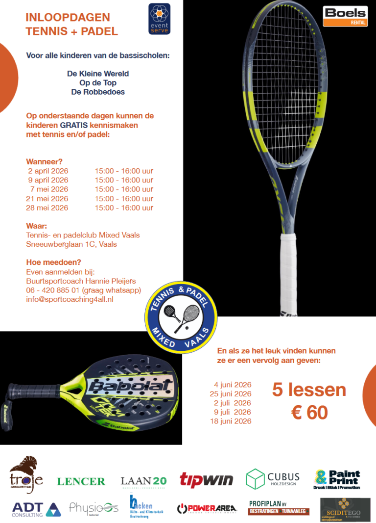 Woon jij in Vaals en zit je op de basisschool? Dan is dit jouw kans om kennis te maken met tennis en padel! In april en mei organiseren wij een reeks gezellige inloopdagen bij Tennis- en padelclub Mixed Vaals.