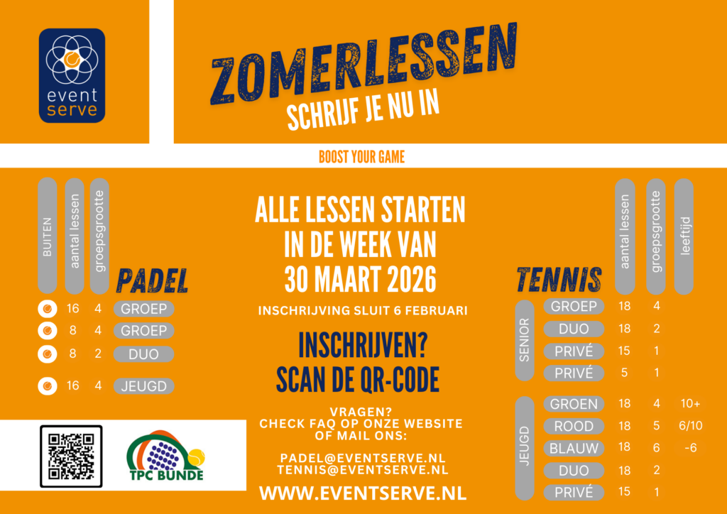 Inschrijven voor tennislessen kan weer vanaf medio januari. De tennislessen starten eind maart 2026.
